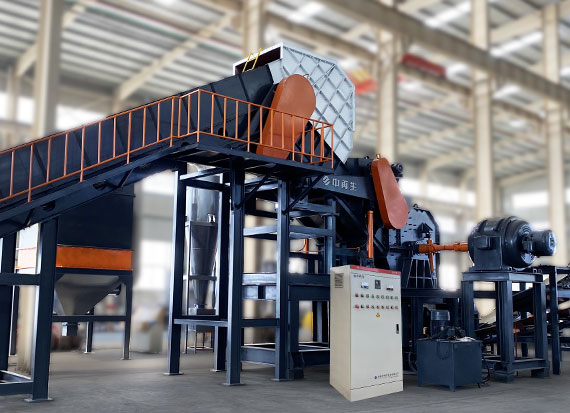 破碎線主機(jī)殼體采用特厚鋼板制造,內(nèi)襯為高錳鑄鋼件,可更換;主機(jī)轉(zhuǎn)子盤安裝于水平軸上,轉(zhuǎn)子盤圓周分布有銷軸,軸向懸有錘頭;主軸用滾珠軸承支撐,循環(huán)油強(qiáng)制潤(rùn)滑冷卻,并裝有溫度傳感器;進(jìn)料口裝有液壓輥筒喂料裝置,位置一高一低,同向旋轉(zhuǎn),能將大件松散物料壓扁,送入破碎腔內(nèi)。