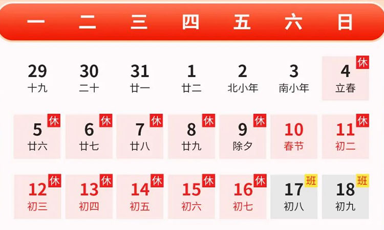 根據國家法定節假日安排,我公司將于2024年春節期間放假,具體時間如下:
