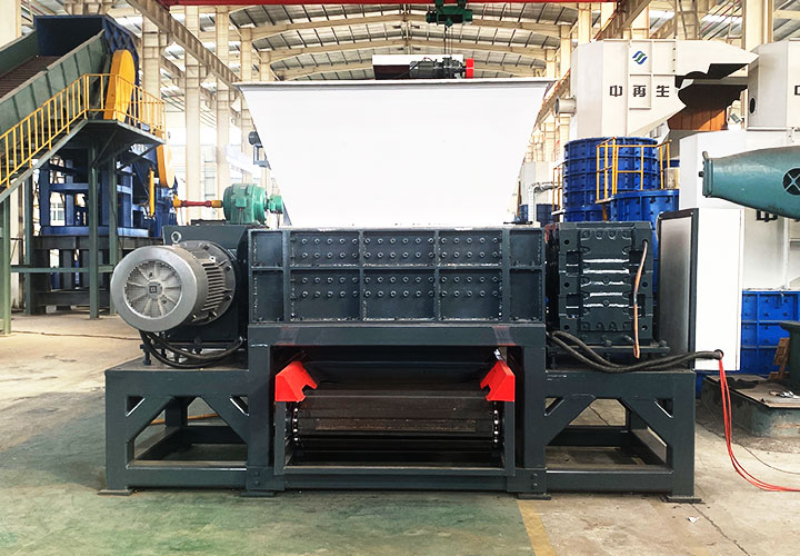 破碎線主機殼體采用特厚鋼板制造,內襯為高錳鑄鋼件,可更換;主機轉子盤安裝于水平軸上,轉子盤圓周分布有銷軸,軸向懸有錘頭;主軸用滾珠軸承支撐,循環油強制潤滑冷卻,并裝有溫度傳感器;進料口裝有液壓輥筒喂料裝置,位置一高一低,同向旋轉,能將大件松散物料壓扁,送入破碎腔內。